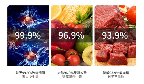 根據國家權威的第三方檢測數據顯示,普樂美“水槽解毒機”可實現99.9%的大腸桿菌滅殺率、96.9%的果蔬農殘去除率以及93.9%的克倫特羅(瘦肉精)降解率(肉樣)。