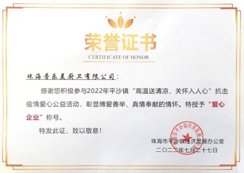 普樂美集團總裁助理姚旋代表公司領取了愛心企業榮譽證書,她表示:疫情無情、人間有愛,普樂美作為一家重點民營企業,始終不忘承擔社會責任。疫情發生以來,公司積極對接團委、黨委、志愿者聯合會等單位,組織志愿者支援前線防控工作,希望通過這份愛心為平沙鎮的疫情防控工作盡一份綿薄之力,并全力支持服務“產業第一”,助力珠海經濟社會高質量發展。